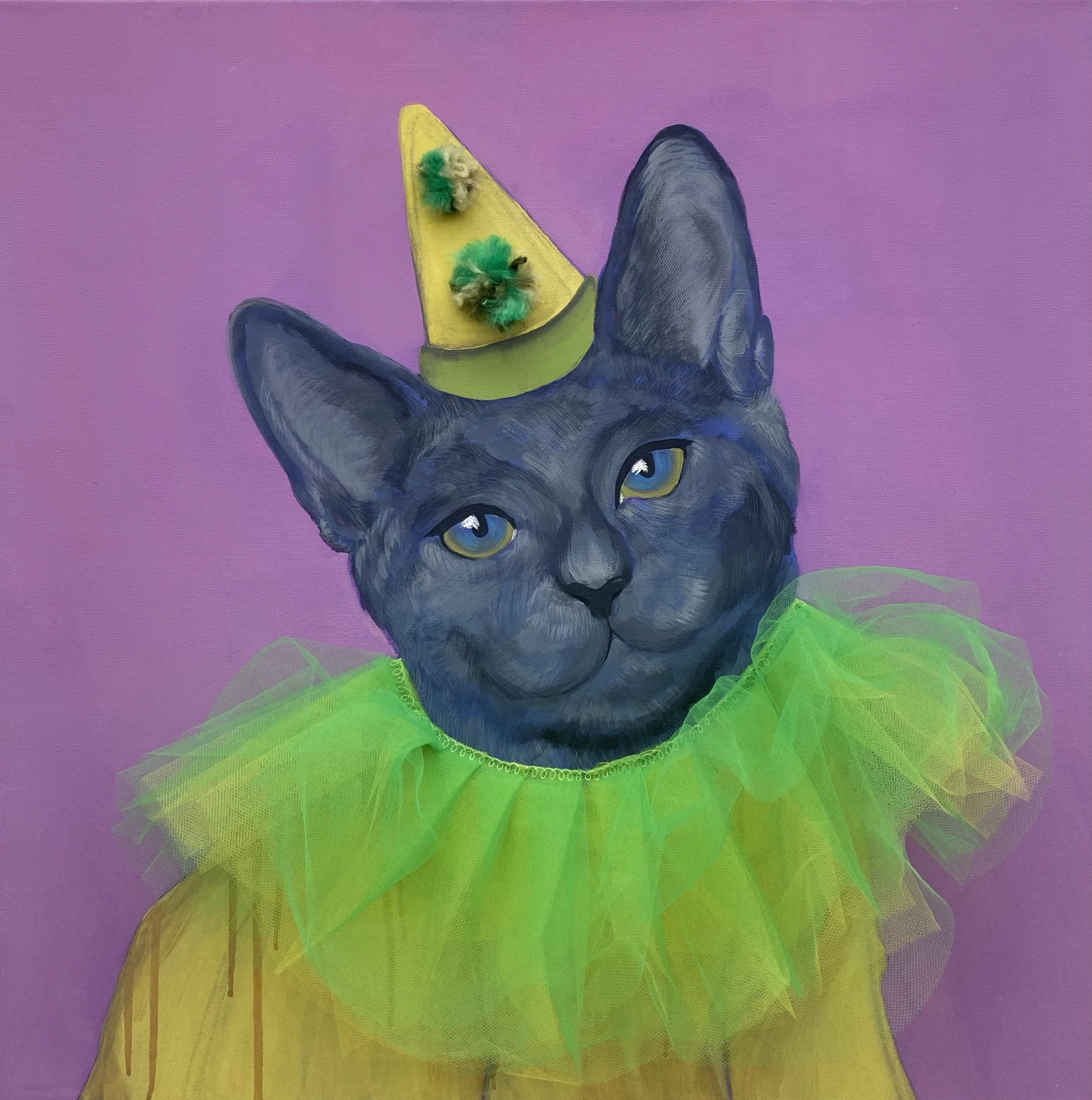 Acrylic, yarn, tulle fabric on canvas