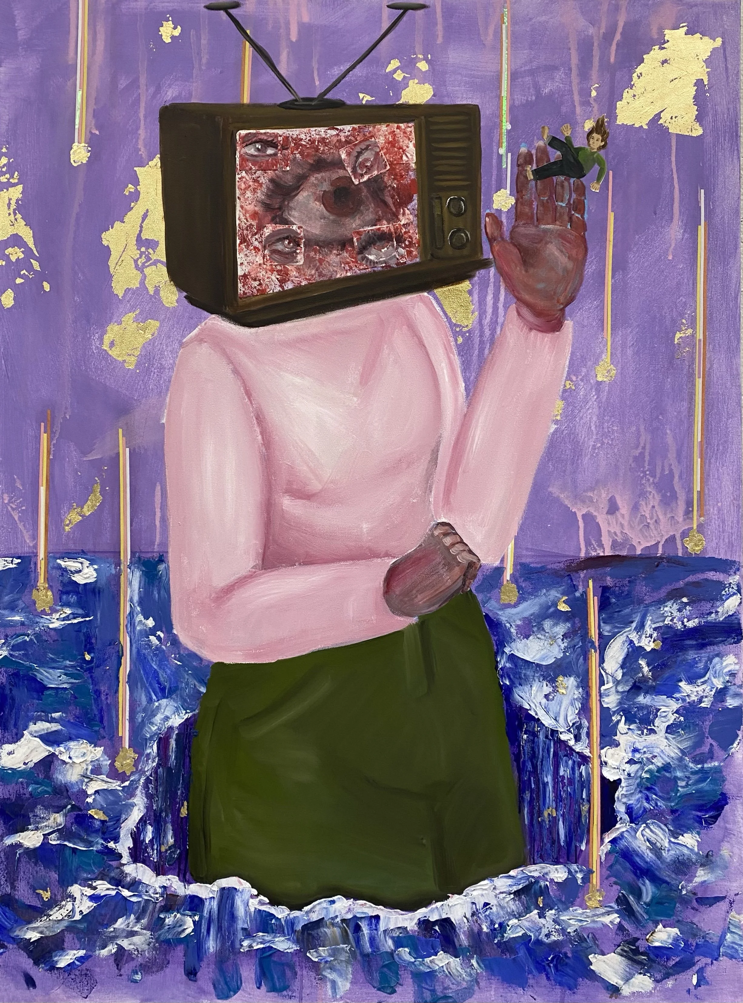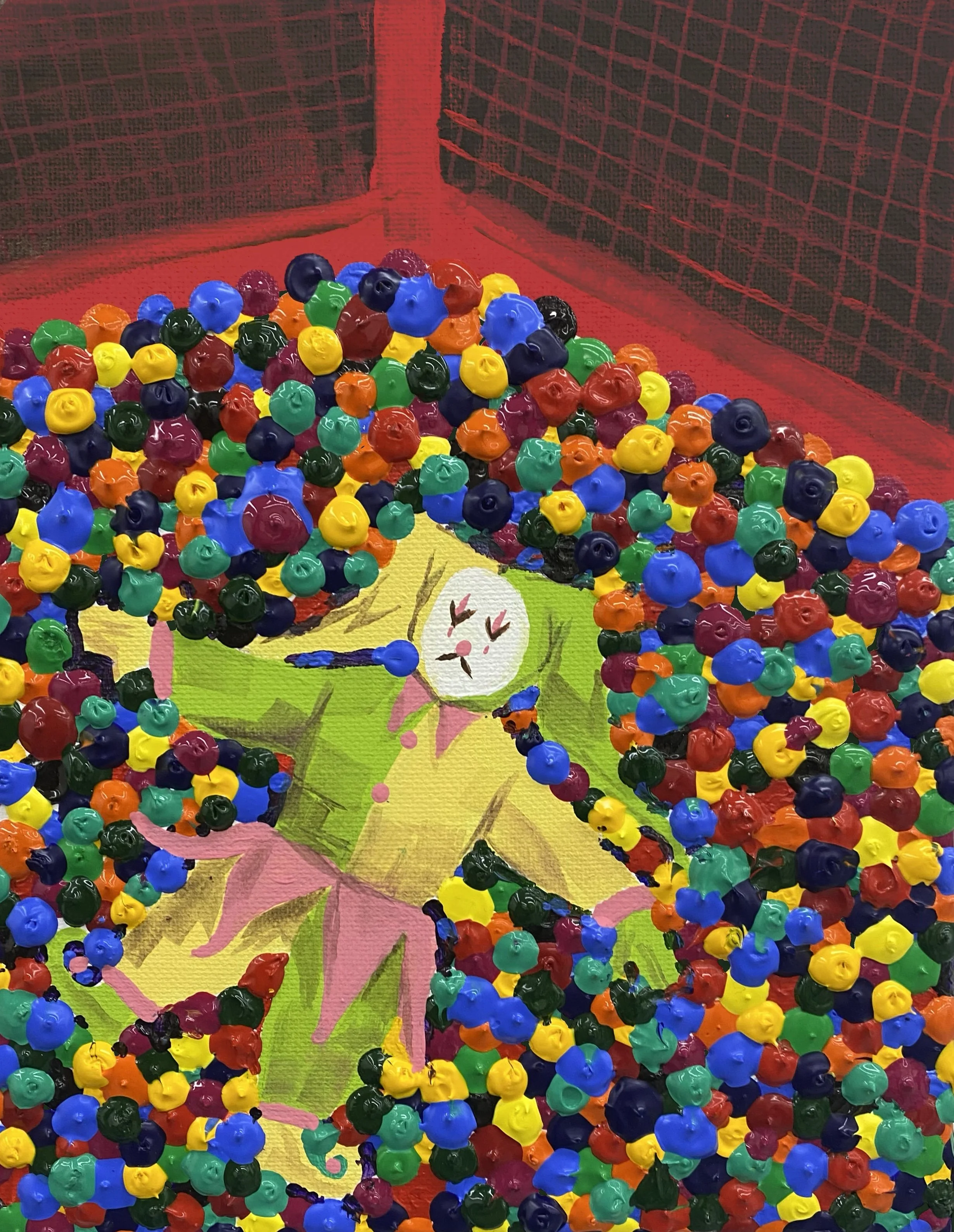 Acrylic paint, gloss medium, tulle fabric on canvas